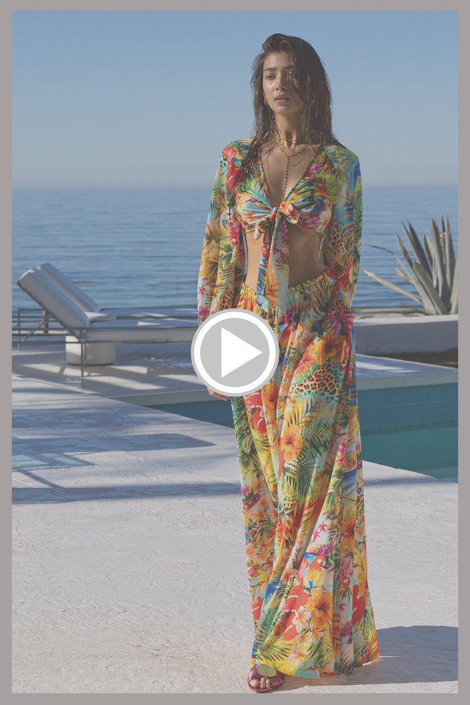 Go anywhere you please knowing that you look effortlessly chic in this Birds of Paradise pant outfit. The exotic print features bright orange, yellow and pink blooms, a scenic background and animal print for a dash of wildness. Easy-going comfort and a great fit is assured with a relaxed crop top that ties in the center and roomy palazzo pants with an elastic waist.
