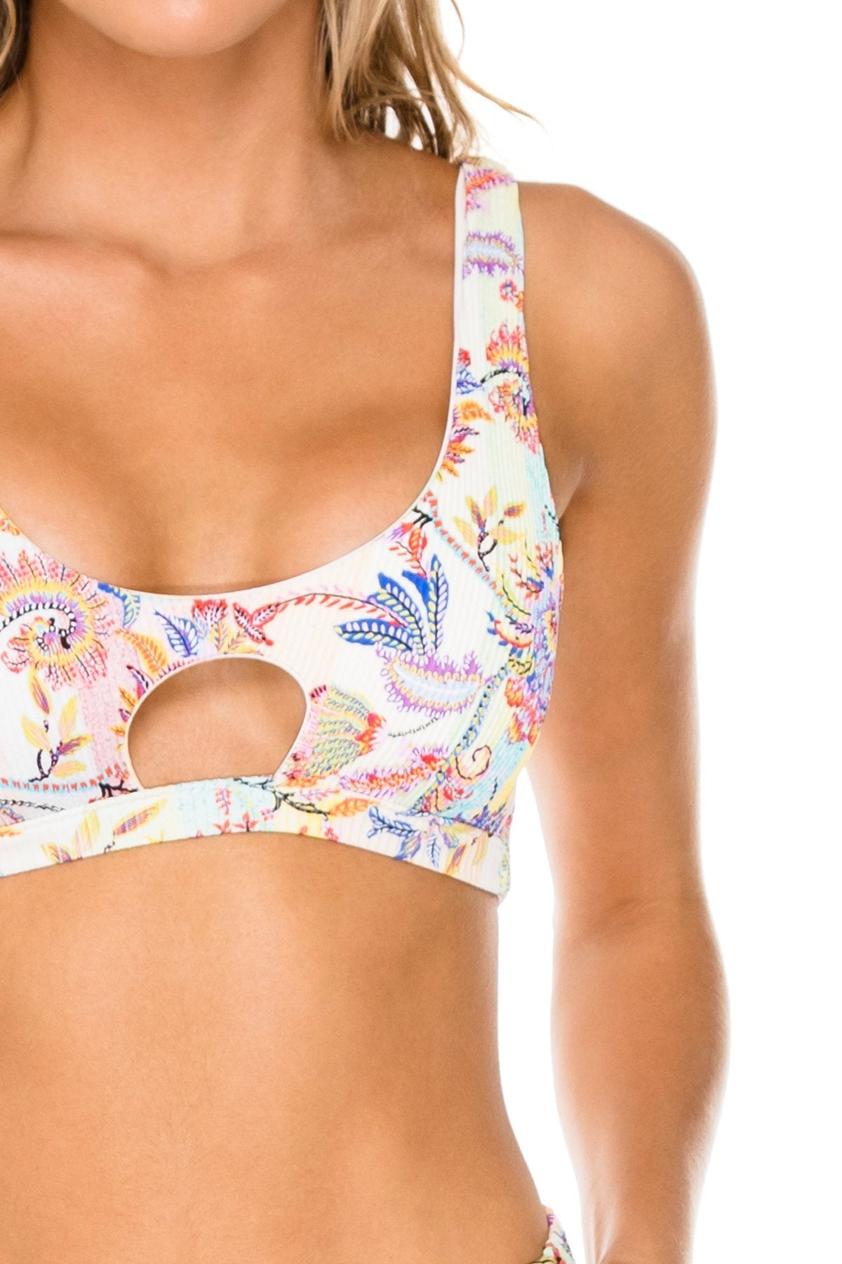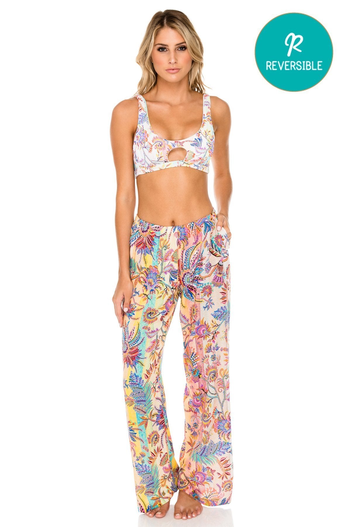 You'll look like a tropical goddess no matter where you are when you wear the Alcazar sporty bralette and matching flared beach pants. The bralette features a sexy front cutout and is reversible to a secondary pastel print while an elastic waistband gives the lounge pants a comfortable fit.