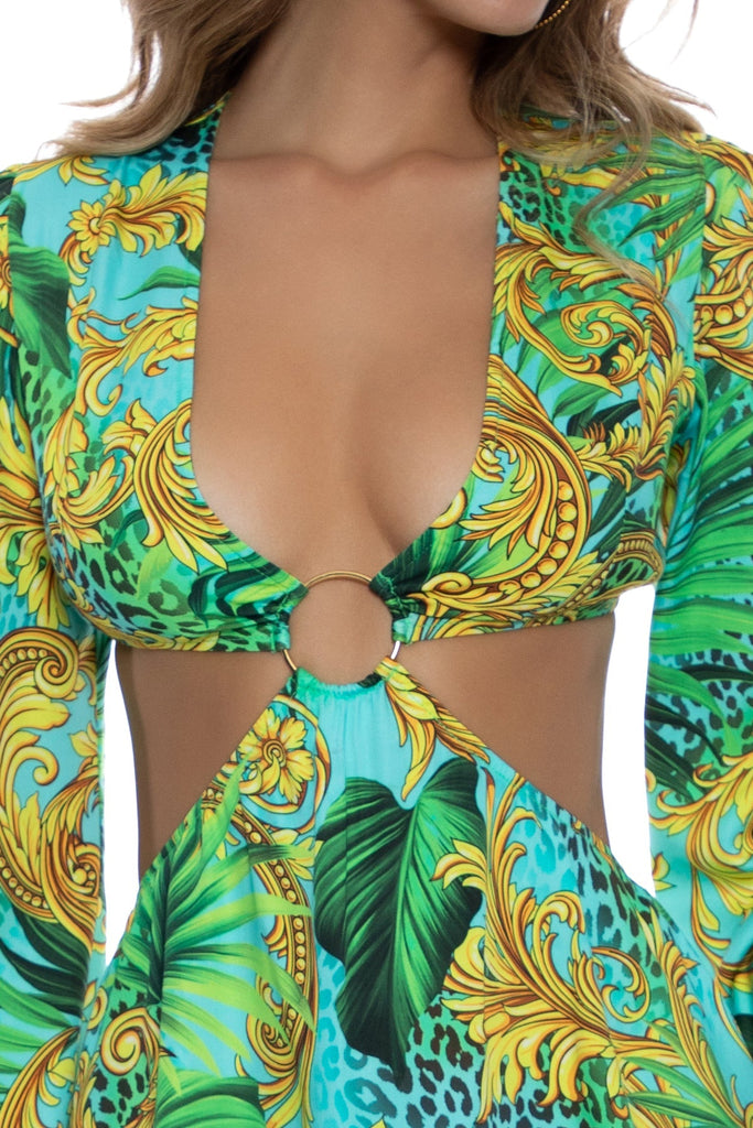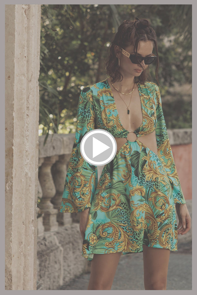 Look amazingly chic while staying cool and confident this vacation season with this multicolored short dress inspired by nature's beauty. A captivating design features lush palm leaves intertwined with gold floral flourishes and a dash of animal print for fun. Enjoy showing off your lovely skin with a plunging V-neck and large cut-out details at the sides. A single large metallic ring at the center brings the bling.