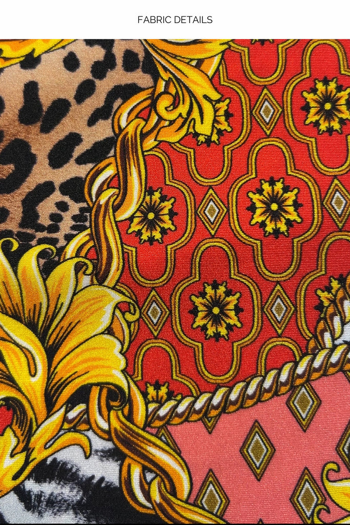 Tropical Majesty is wild glamour redefined—where zebra stripes and leopard spots meet fiery orange tones and sunlit gold. Luxe chain embellishments elevate each piece into a statement of bold elegance, perfect for the queen of every getaway.