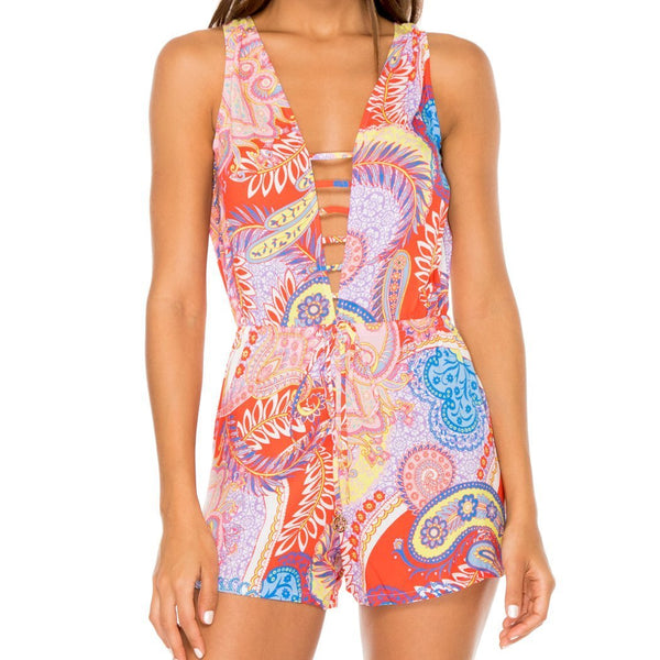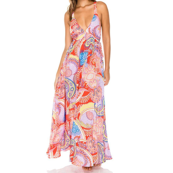 Get the perfect figure-flattering style with this Dynasty V-Neck Short Dress from Luli Fama. The flirty, flowy style includes a sultry plunging neckline and adjustable side ties that allow you to modify the cleavage. The bold, vibrant pattern on this deep V-neck dress is ideal for adding to your resortwear collection.