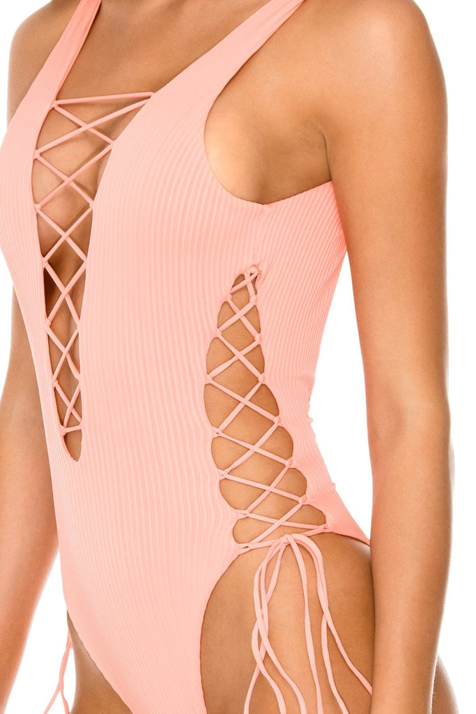 The Orillas del Mar one-piece swimwear bodysuit always fits perfectly thanks to the lace-up string ties on the sides. This sexy suit also includes a lace-up plunging neckline, an open back design and high-leg, cheeky cut. Wear it in the water or pair it with pants, shorts or a skirt for everyday wear.