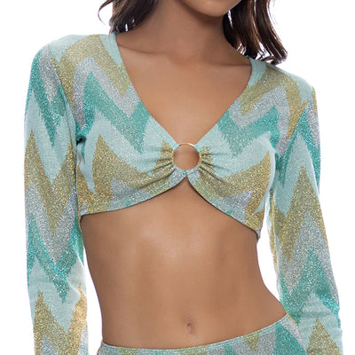 Get ready to reign in style with this queenly ensemble designed to make you feel like royalty at your next tropical escape. The flirty crop top features a dazzling center ring detail that highlights your beautiful curves, while the long bell-shaped sleeves add a touch of bohemian flair. With a plunging V-neck, this top is both sexy and playful, perfect for when you want to make a statement without saying a word.