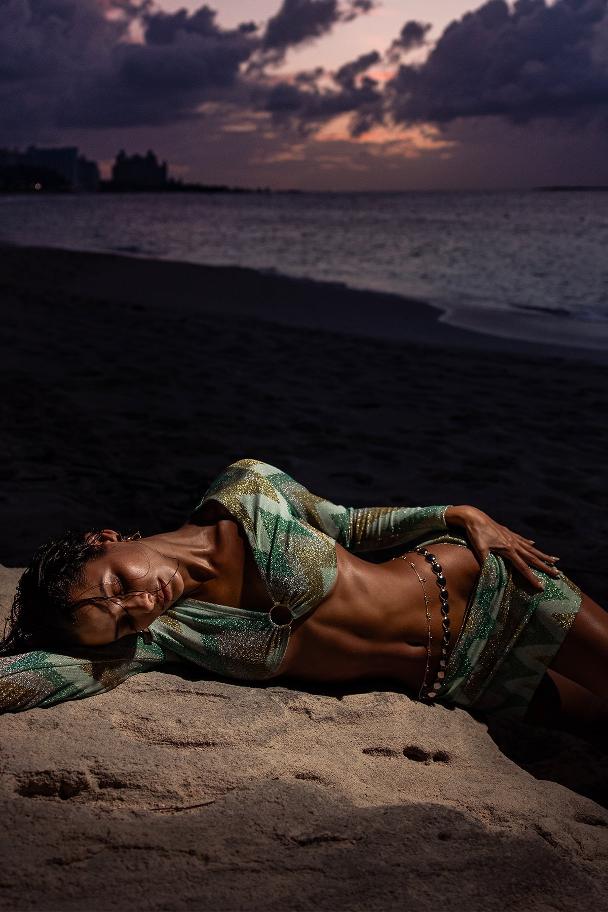 Paired with the matching mini skirt, this set is all about fun and flirty vibes. The skirt's side slit adds an extra dose of allure, while the easy pull-on style makes it as effortless as it is eye-catching. Together, the top and skirt create a figure-flattering silhouette that keeps you feeling confident and ready for any beachside adventure.