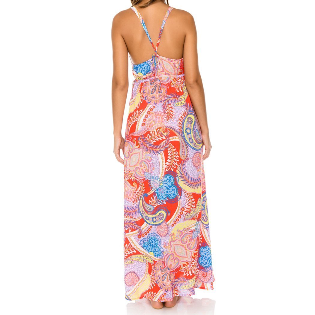 -Flowy style dress -Plunging V neckline -Tie adjustments on sides allow you to customize your fit and accentuate your body shape -String ties completed with out classic Luli rings -This long maxi dress is ready to dance with you on you your tropical getaway -Prints are not exact and may vary according to cut -Fabric is 100% Viscose