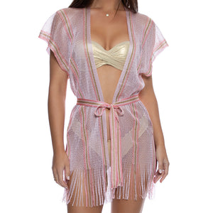 - Trendy Open-front Poncho Dress That Doubles As A V-neck Beach Cover Up - Sheer Design So You Can Show Off Your Suit Underneath - Shimmery Fabrics Beautifully Compliment Any Luli Kini - Waist Tie And Leg Slits On Both Sides Of Fringe Skirt For Comfy Fit And Movement - Short Caftan Style Completed By Fringe Trim - Pull On Styling - Available In One Size, Which Fits Most - 100% Nylon