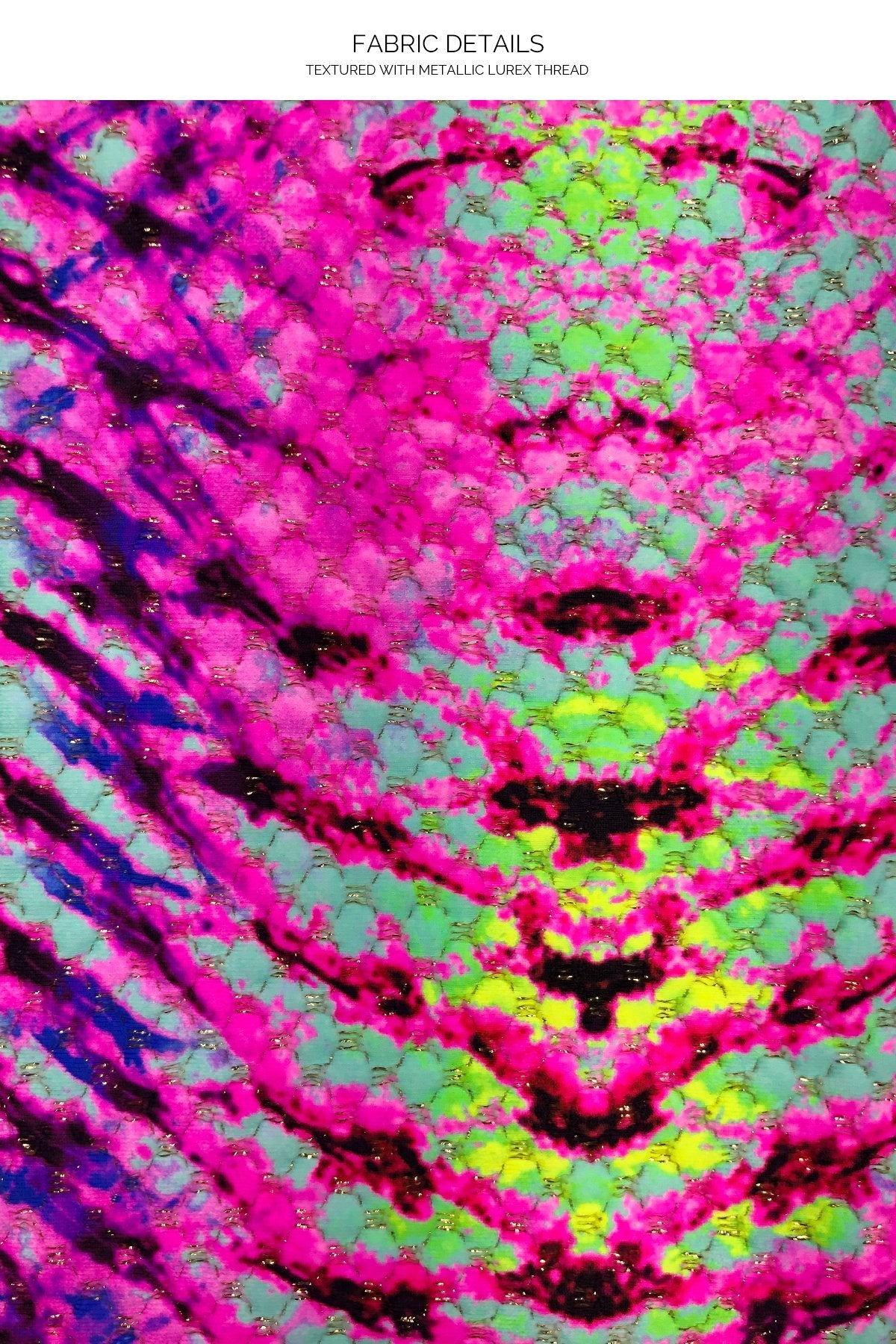 This color brings you the perfect summer vibrancy. Gorgeous purple and lime hues mix into a print that is sure to impress. Includes edgy Luli babe styles and stylish resortwear to match.