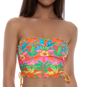 - Tube Top Style - Drawstring Side Details - Drawstrings Allow You To Style To Your Choice - String Ties Completed With Signature Luli Rings - Gold Wavy Trim Finish - Pull On Styling - Prints Are Not Exact And May Vary According To Cut - 80% Nylon 20% Spandex - No Padding