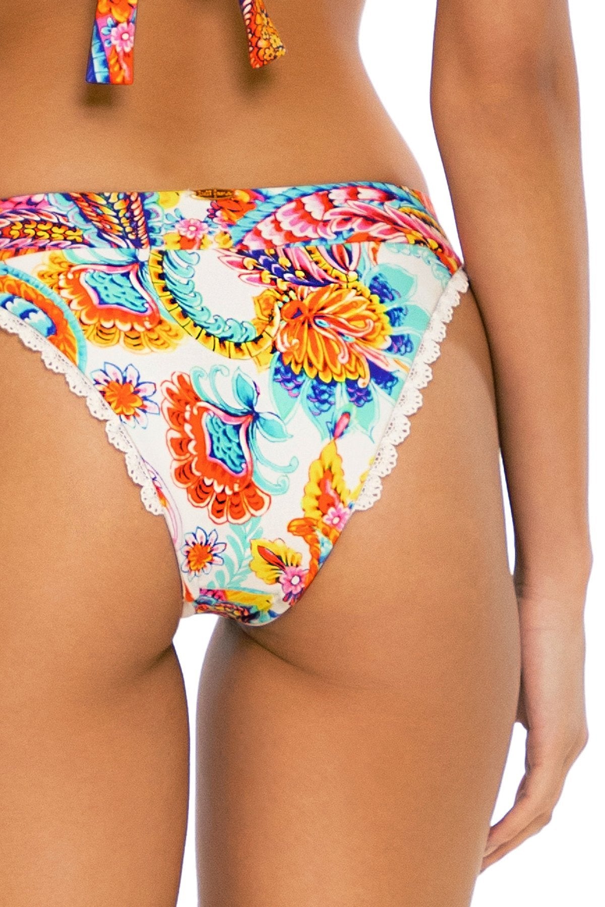 Tiki lights and summer romance inspired this bold and vibrant collection. Lace trims and delicate gold details illuminate this prints vibrancy. Offering a variety of chic styles and fabulous resortwear this collection will have you ready to dance in the moon night.