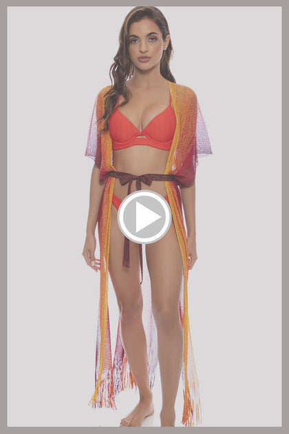 Poncho style caftans in both long and short versions offer flirty slits on the sides and comfortable waist tie. Deep V neckline for a sexy added touch. These pieces will be the finishing touch to any getaway.