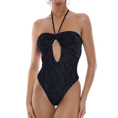 The eyes are immediately drawn to the beautiful bandeau-style top featuring horizontal textured lines leading to a center point. Irremovable cups allow you to achieve a lovely, rounded shape that provides great coverage and a dash of sensualness. Secure the top by tying the adjustable spaghetti straps around your neck as loose or tight as you desire.